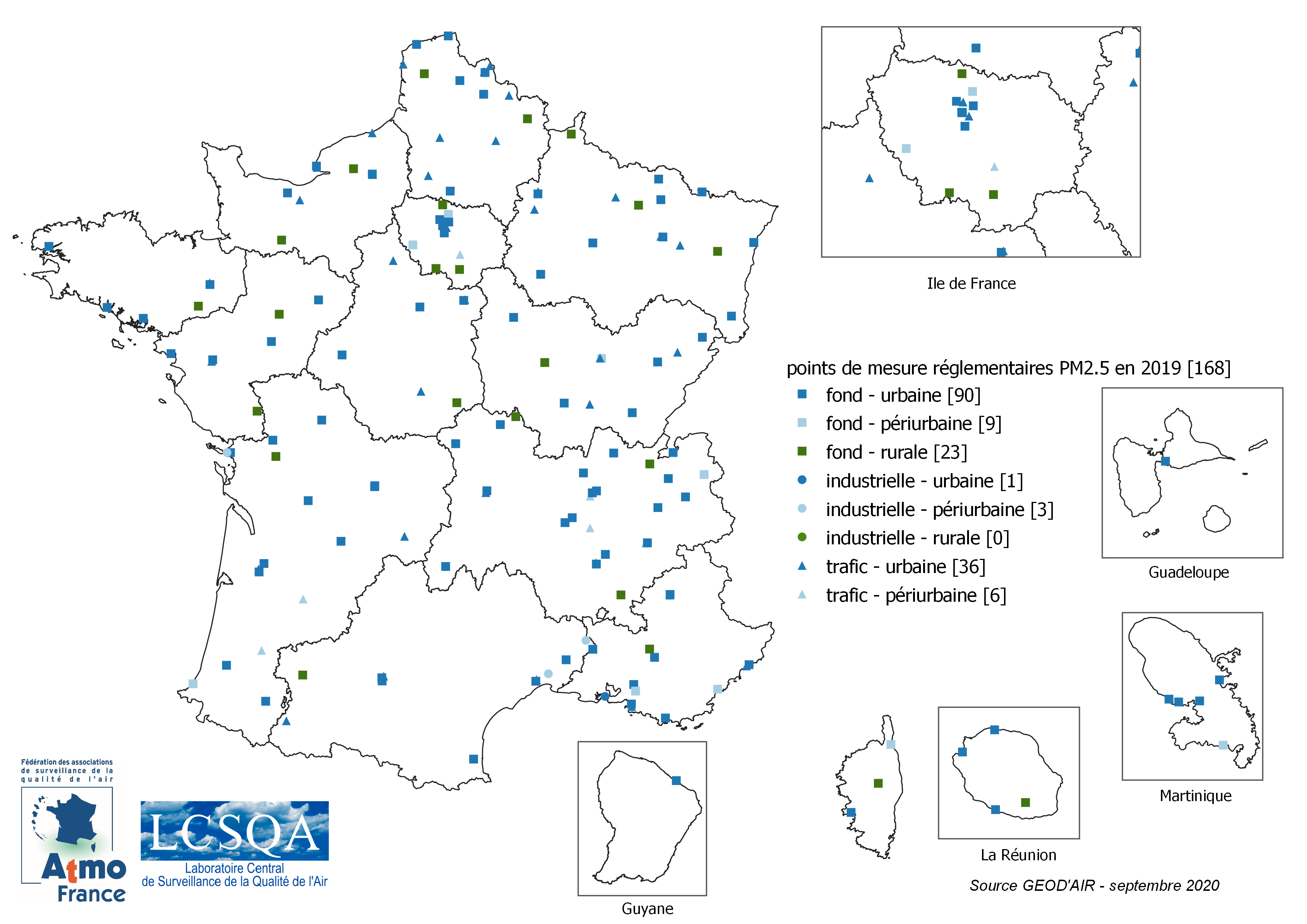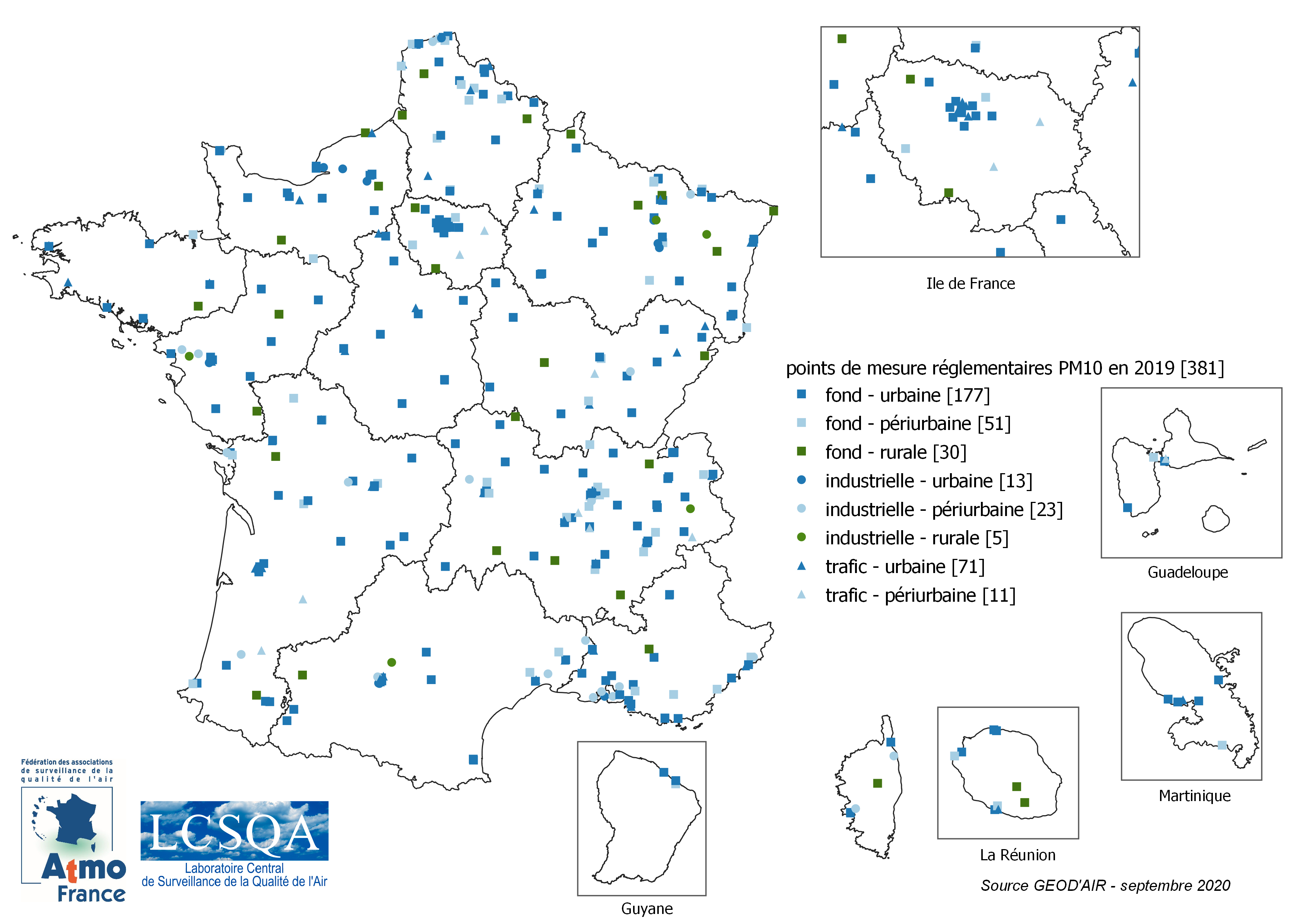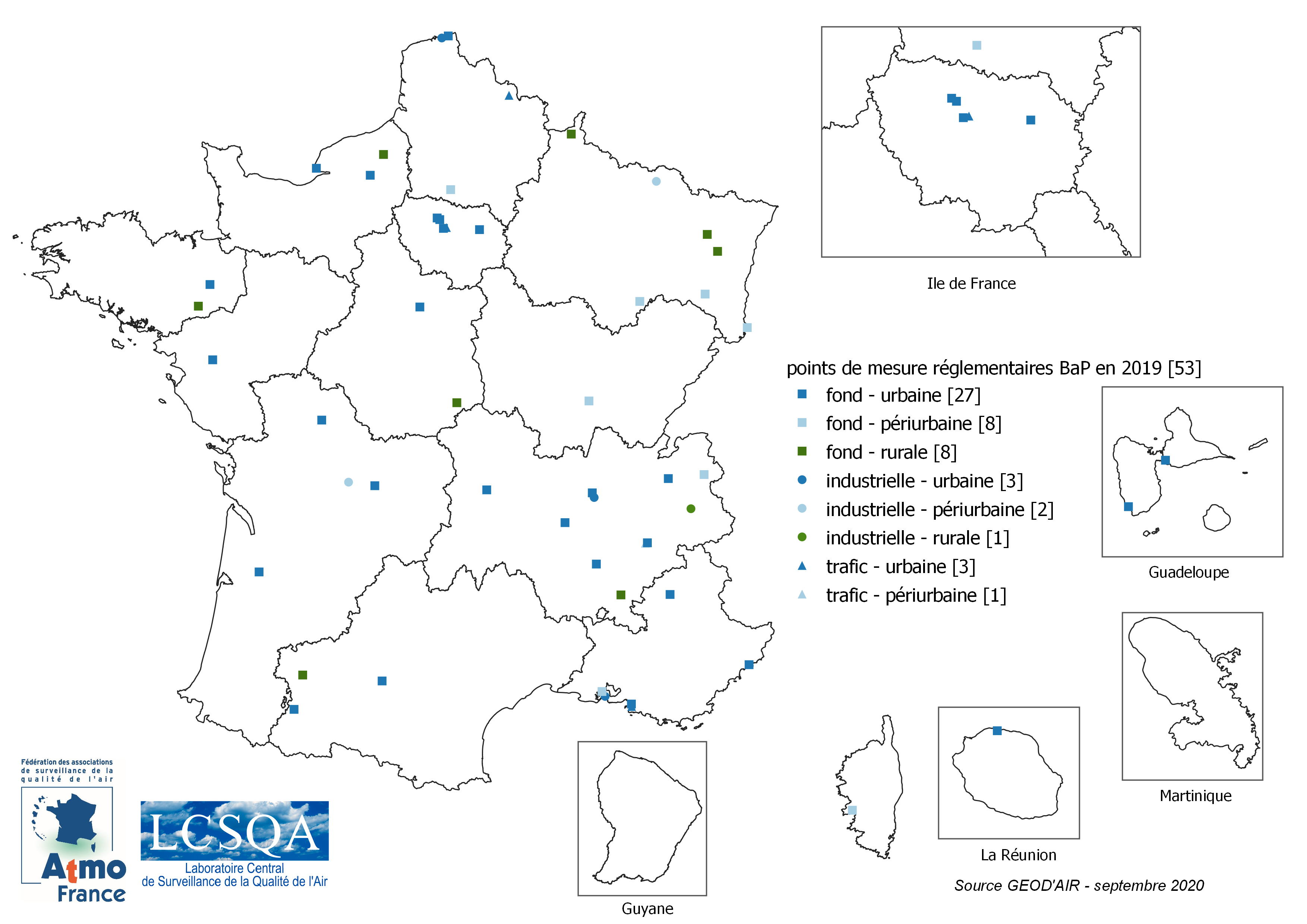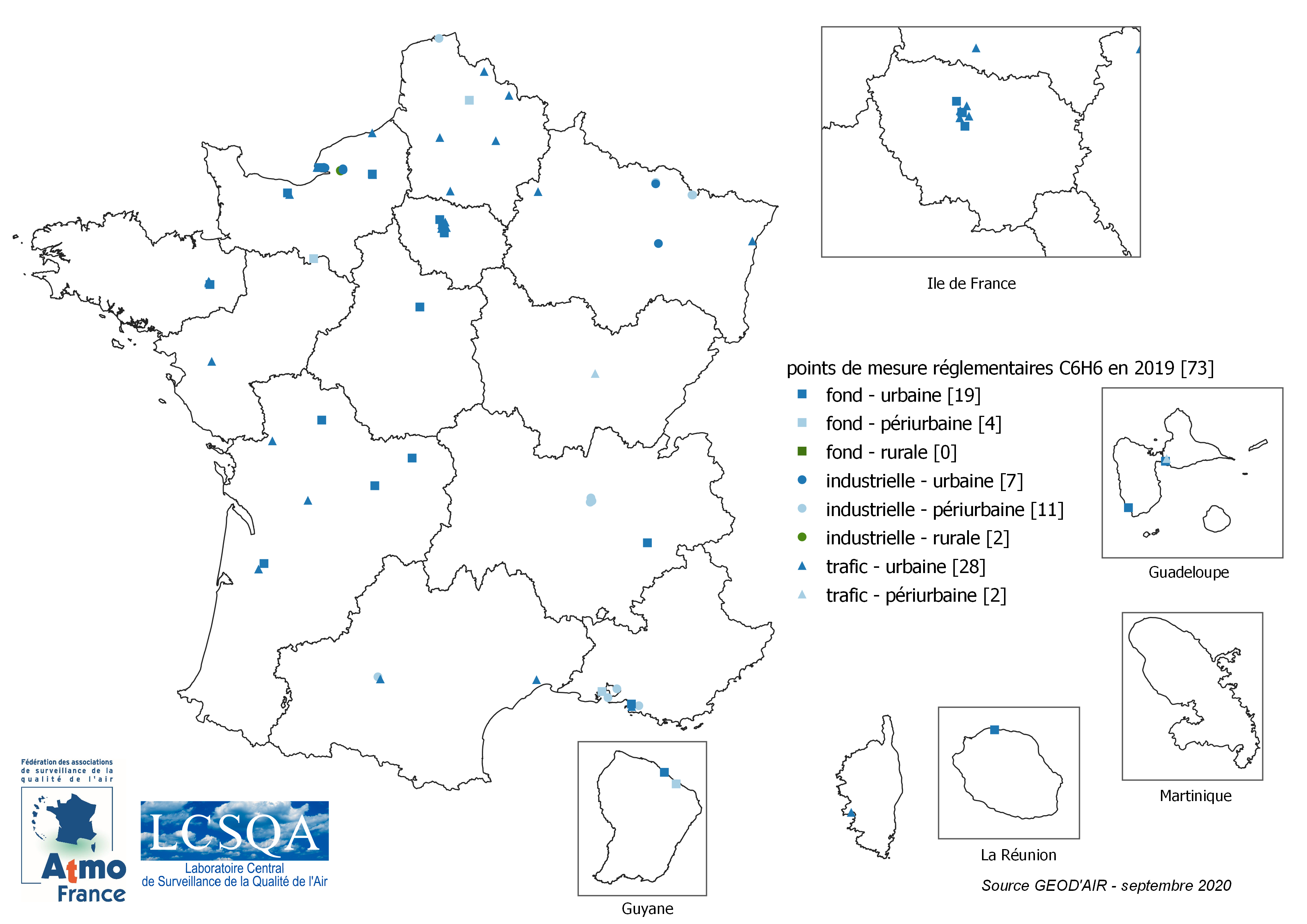 - Des cartes représentant les points de prélèvements participant au rapportage pour 2019 pour chaque polluant réglementé sont téléchargeables. Elles précisent la typologie de la station associée (urbaine, périurbaine et rurale) ainsi que le type d’influence sur la mesure (influence industrielle, influence du trafic et fond).
